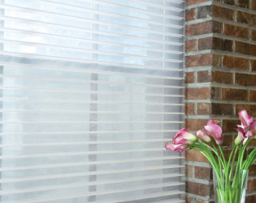 The horizontal fabric vanes are translucent or light blocking held by two vertical layers of sheer fabric. |